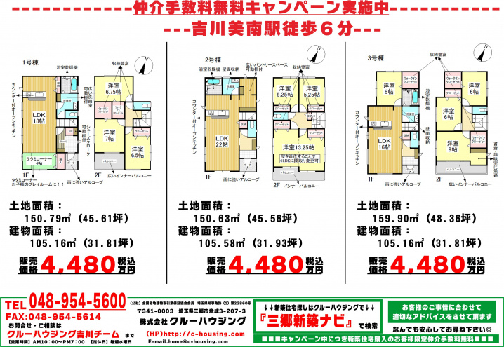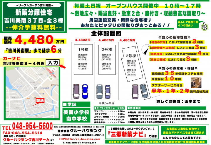 ②【美南3丁目 新築戸建 全3棟 吉川美南駅徒歩6分 4,480万円】