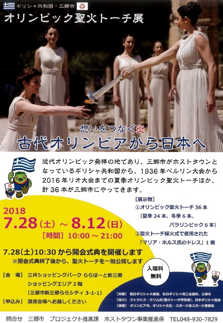 近代オリンピック発祥の地であり、三郷市がホストタウンとなっているギリシャ共和国から、1936年ベルリン大会から2016年リオ大会までの夏季オリンピック聖火トーチほか、計36本が三郷市にやってきます。