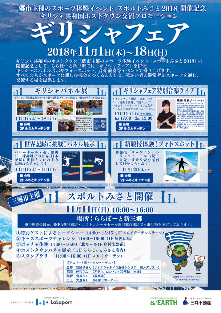 ギリシャ共和国のホストタウン三郷市主催のスポーツ体験イベント『スポルトみさと2018』の開催記念として、ららぽーと新三郷では『ギリシャフェア』併催。