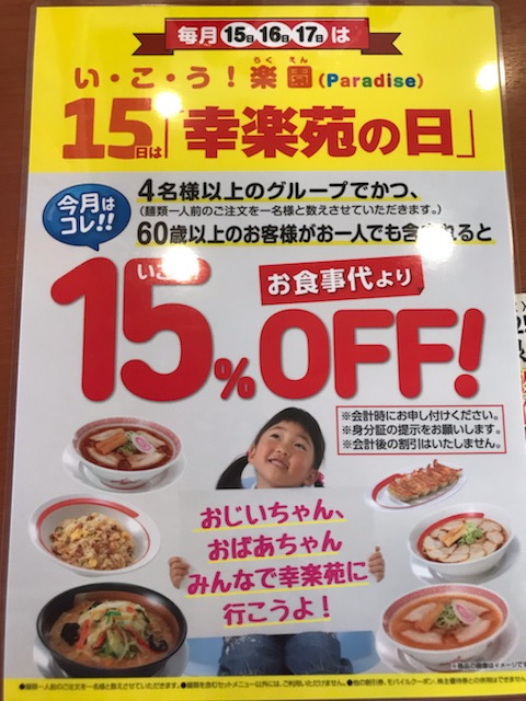 シルバー企画と題して、太っ腹企画もやっています!!おじいちゃん、おばあちゃんとみんなで幸楽苑に行きましょう!!※変更があるようなのでご注意ください