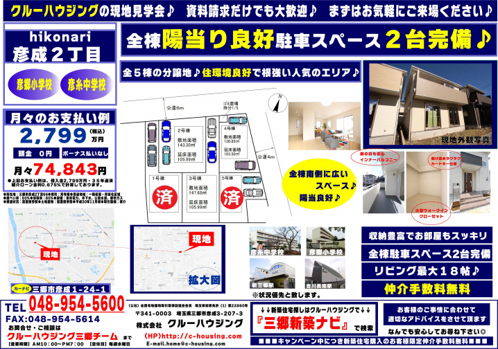 ②【彦成1丁目 新築戸建 全6棟 陽当良好 敷地広々 駐車2台可 2,599万円~】