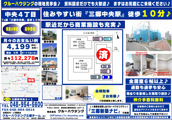 ①【あと2棟 中央4丁目 新築戸建 三郷中央駅 徒歩10分 4,199万円~】