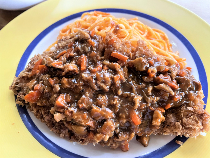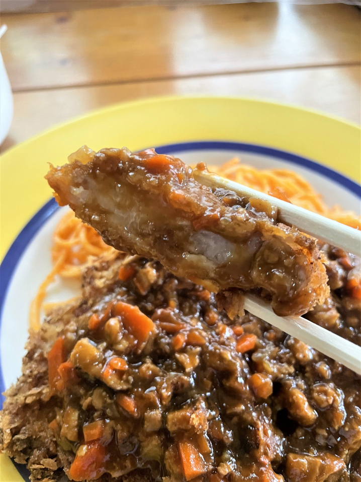 トンカツにはあんかけっぽいミートソースがたっぷりかかっています。