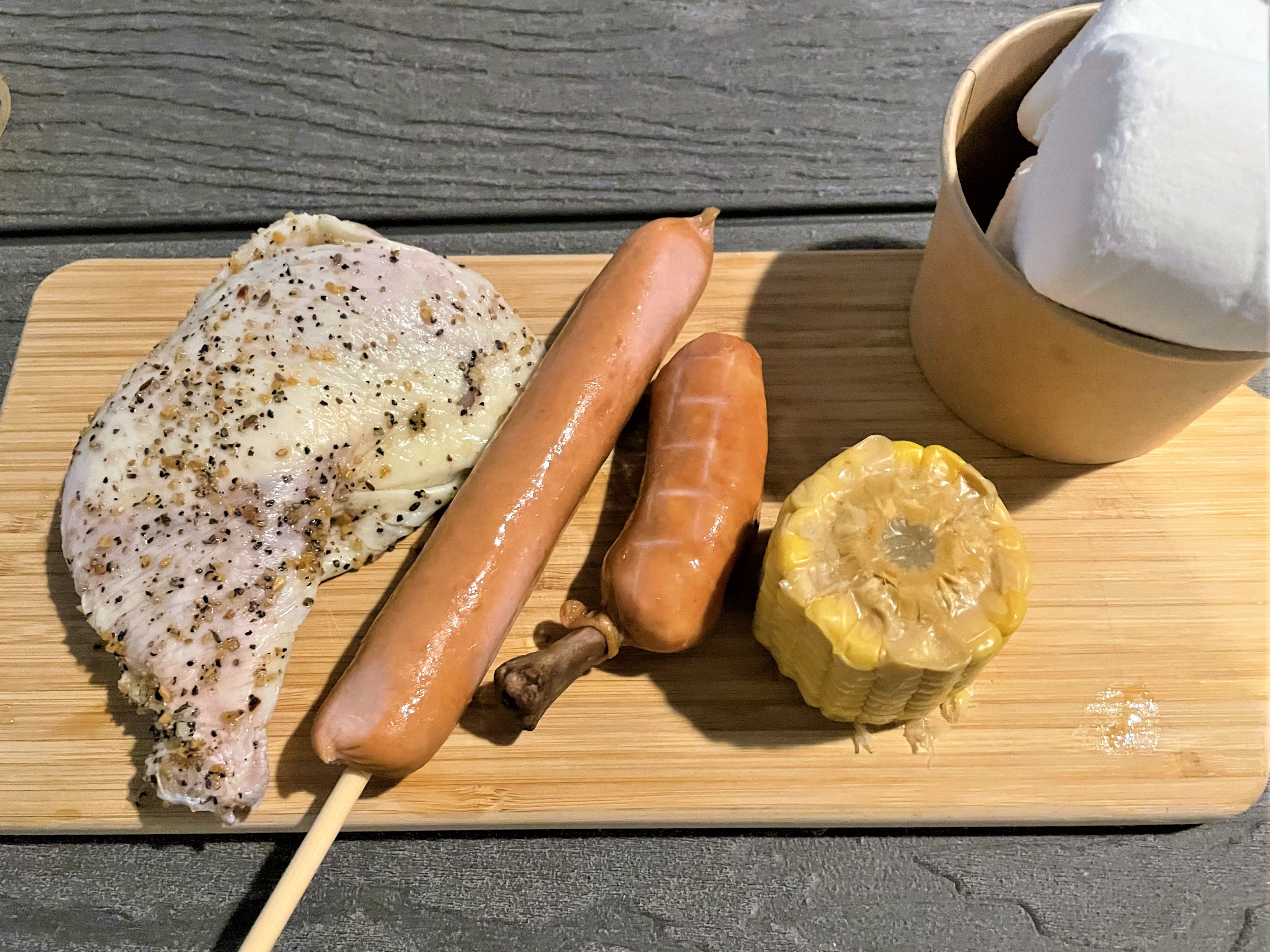 骨つきフランク⇒スモークベーコン⇒鶏レッグ⇒豚肩ロース⇒野菜セット