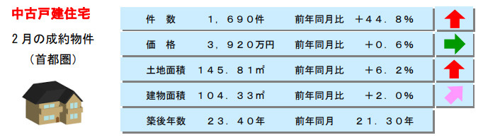 2月の中古戸建の成約件数前年同月比+44.8%の大幅増となり、4カ月連続で前年同月を上回りました。成約価格は前年同月比+0.6%とほぼ横ばいになりました。
