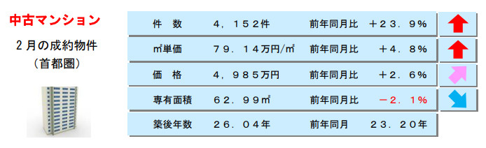2月の中古マンション成約件数は前年同月比+23.9%と2ケタの大幅増となり、4ヶ月連続で前年同月を上回りました。