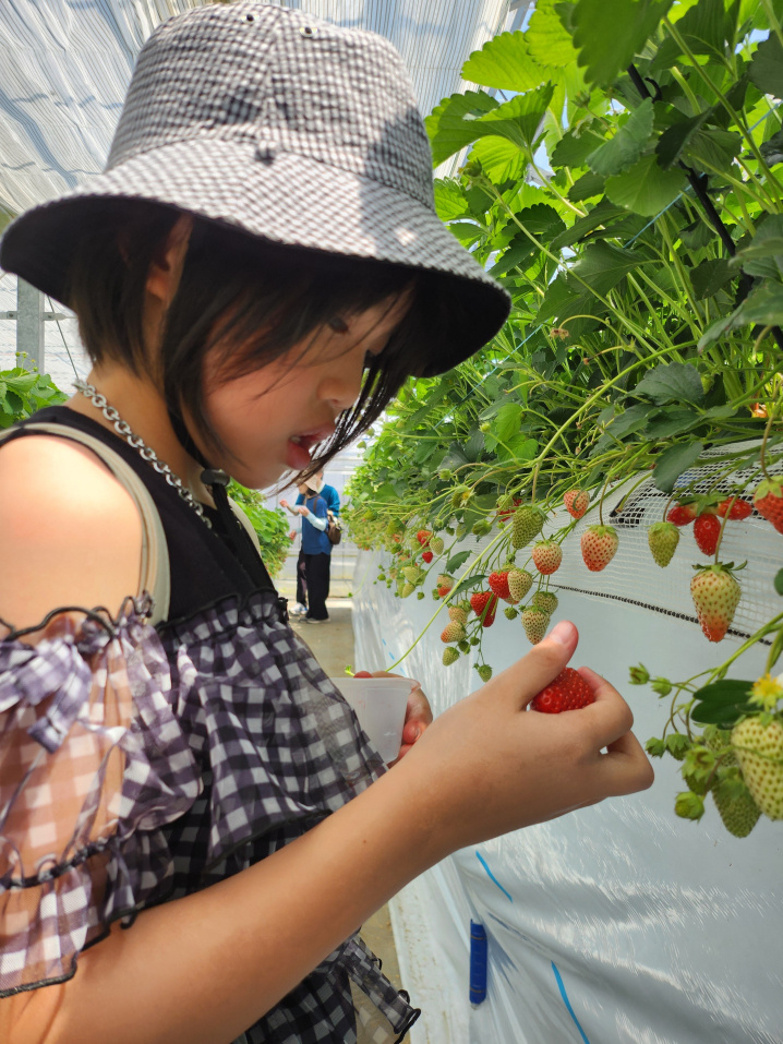 通路も比較的フラットで快適に楽しめる環境が整っていました。 また、いちごの高さも調整されているのか、立ったまま無理なく摘めるのもありがたいポイントです。