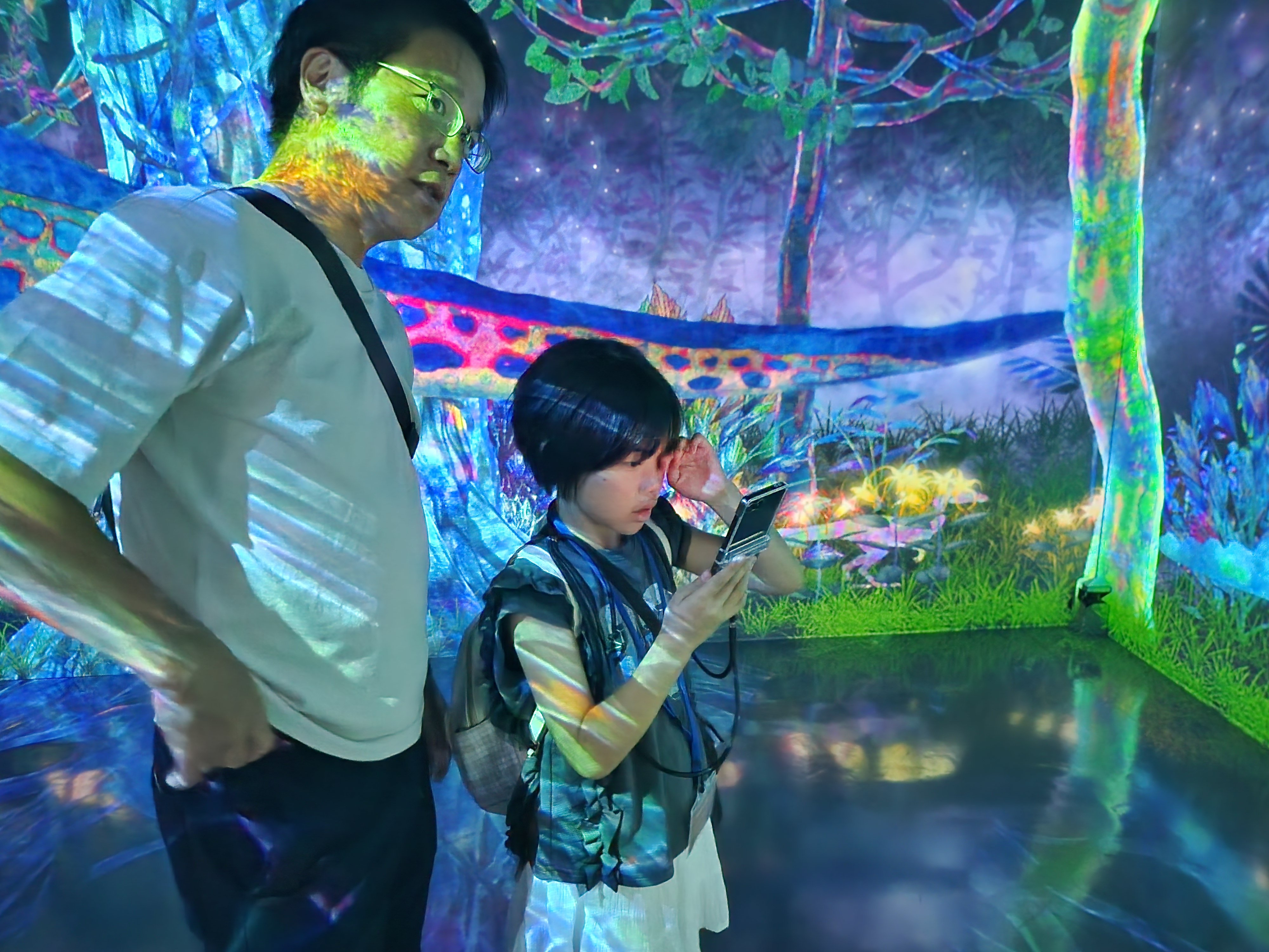 チームラボとGalaxyがコラボしたデジタルアート空間で、Galaxyスマホを片手に恐竜を探し、捕まえてコレクションしていきます。 恐竜たちは壁や床いっぱいに映し出され、まるでそこに存在するかのような迫力。