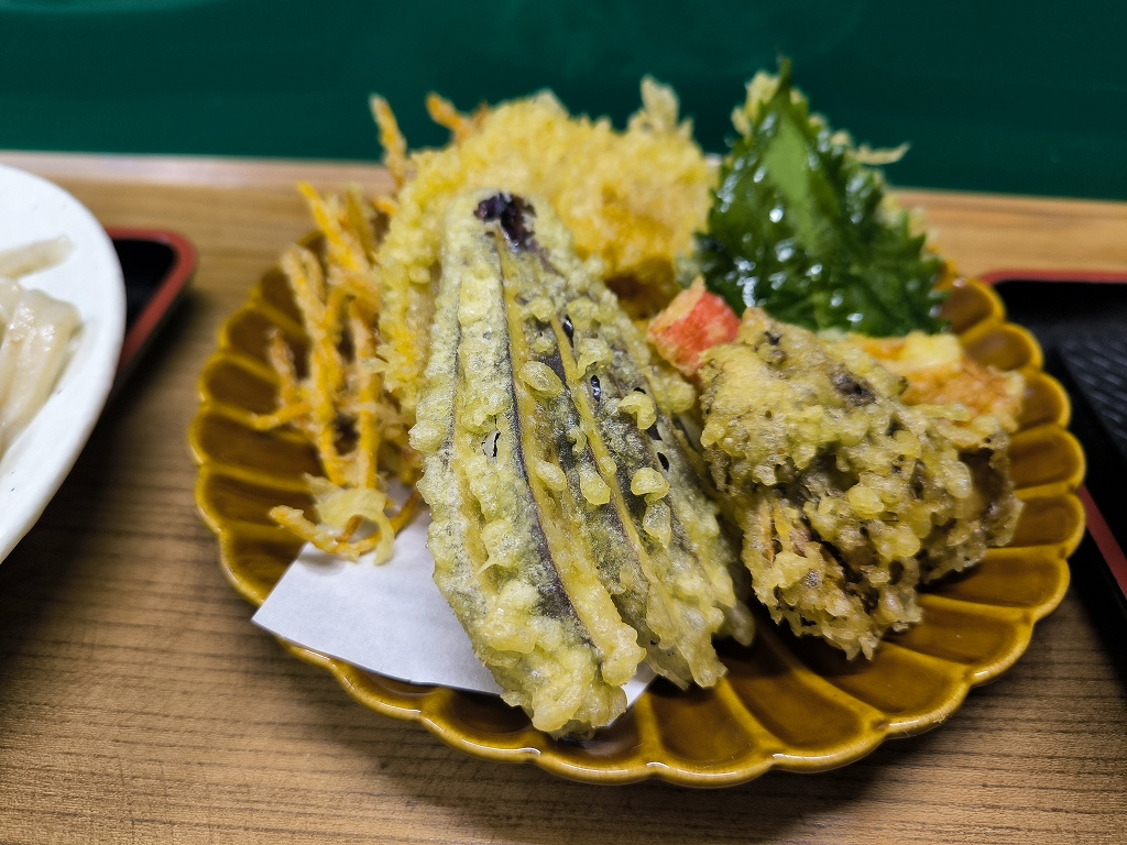 野菜天ぷらはナス、舞茸、かぼちゃ、大葉、にんじんなどの盛り合わせ。